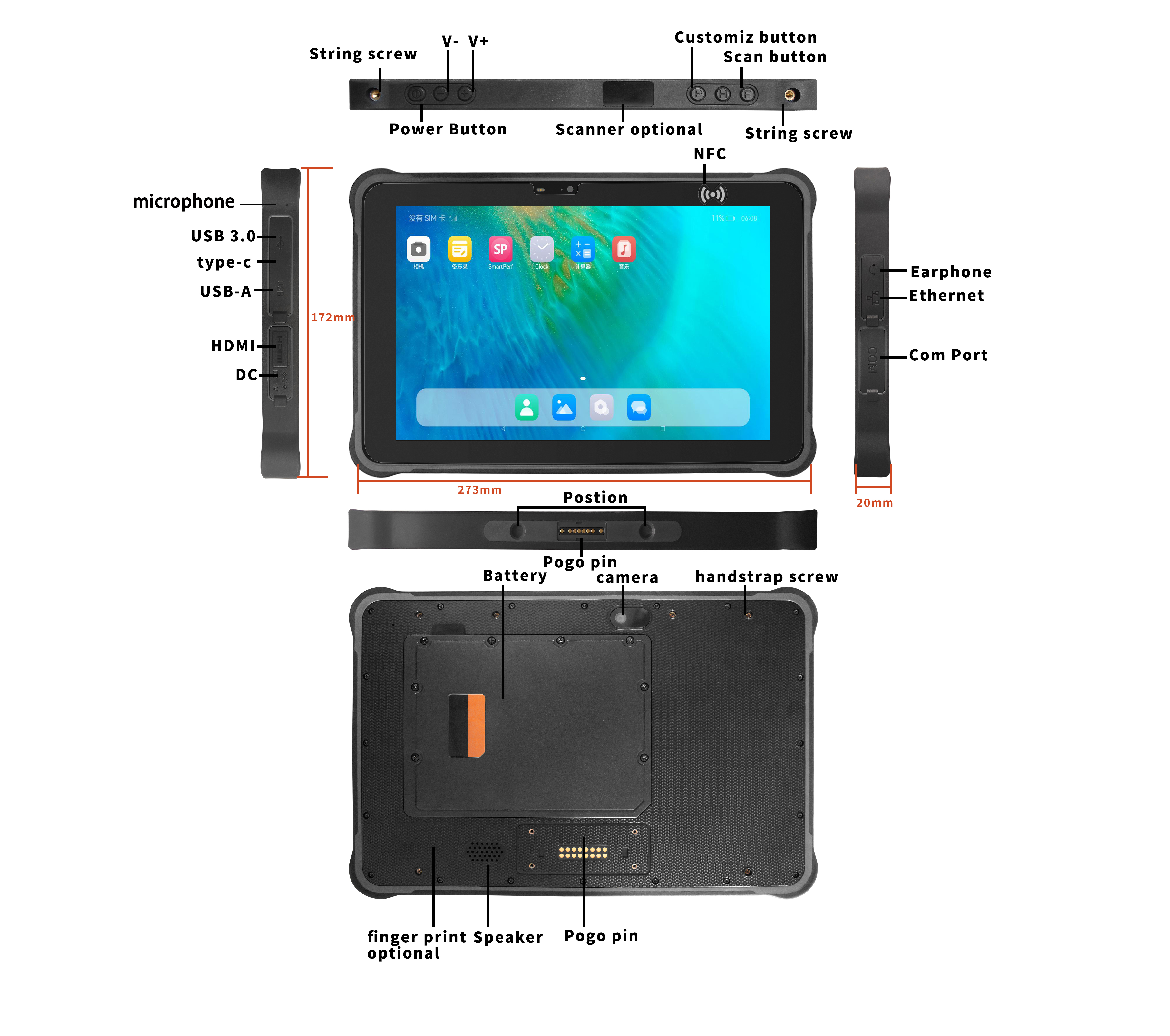 Type-C ×1 (поддержка OTG; поддержка быстрой зарядки); Слот для SIM-карты×1; Слот для TF-карты×1; Джек для наушников×1; DC×1 (4.0×15 мм); USB-A:USB 2.0 ×1 + USB 3.0 ×1; RJ45×1; RS232×1; HDMI×1 Нижняя pogopin: USB 2.0; Зарядка; RS232 Задняя pogopin: USB 2.0; RS232 |