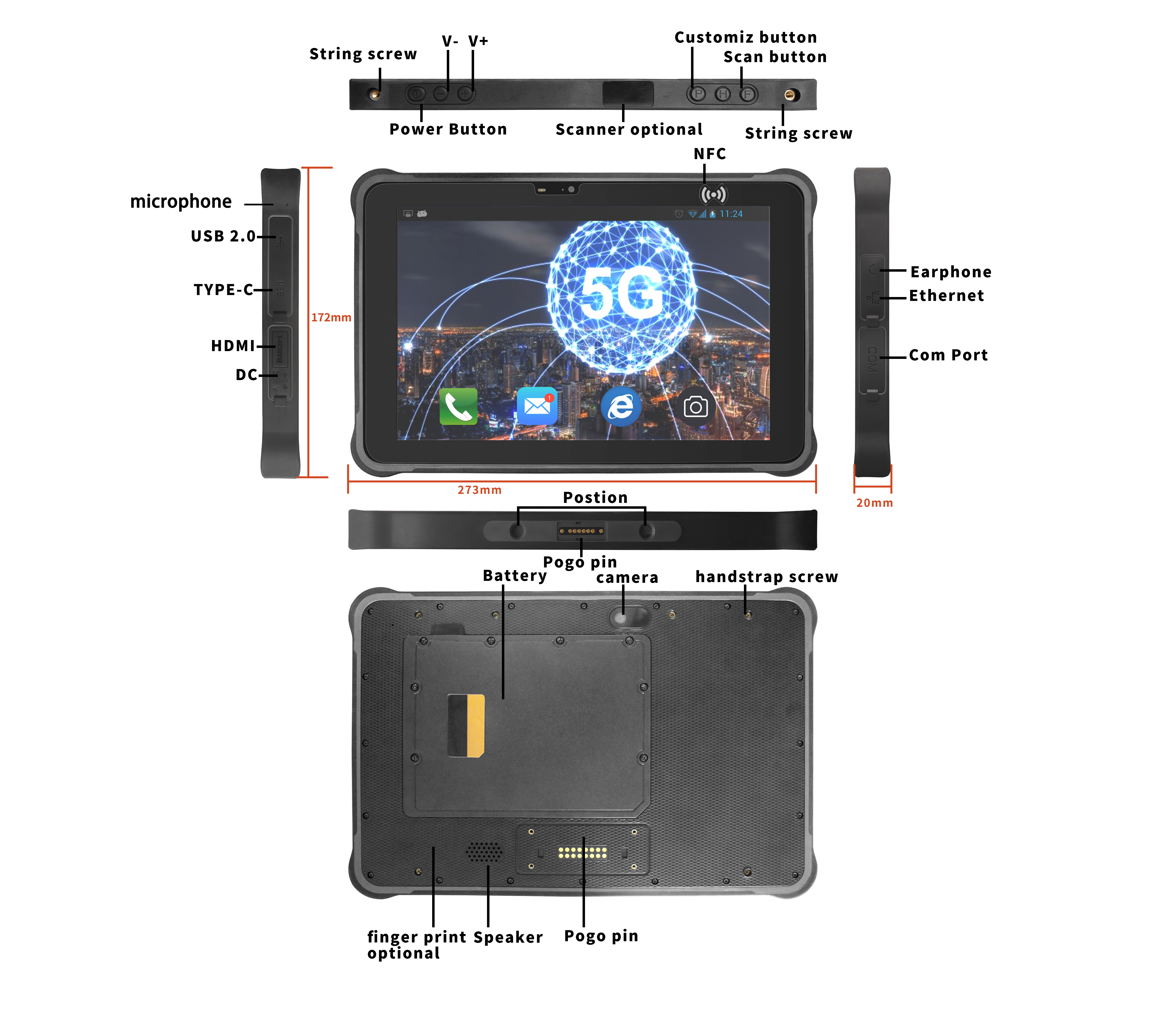 Type-C *1 (OTG); Слот для SIM-карты*1; Слот для TF-карты*1; Наушники*1; DC*1 (3,5×12 мм); USB 2.0 *1; RJ45*1; RS232*1 Нижний pogopin: USB 2.0; Зарядка; RS232 Задний pogopin: USB 2.0; RS232 |