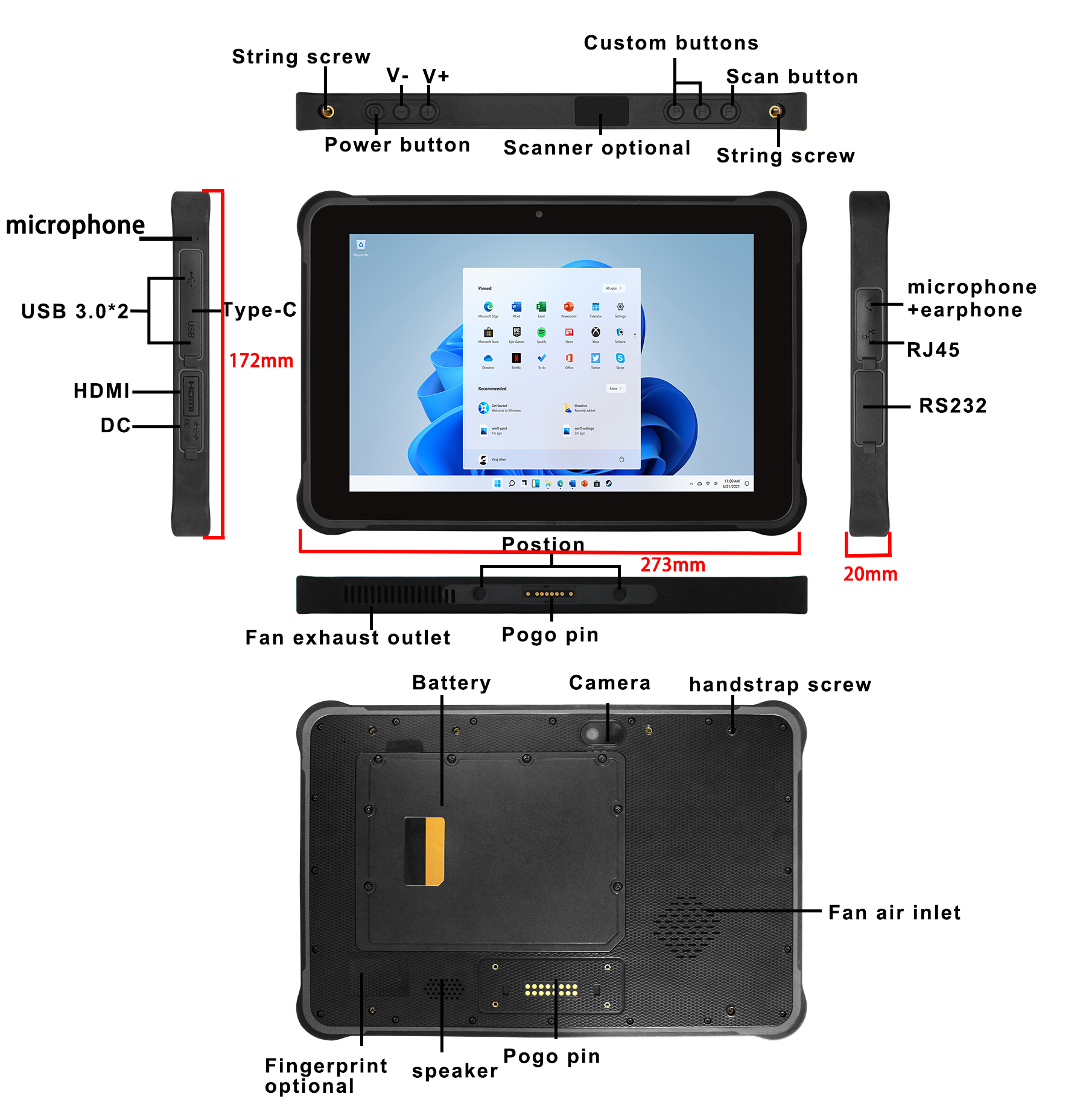 | Порты ввода/вывода | DC×1 (4,0×15 мм); HDMI Type A ×1; USB Type_A: USB3.2 Gen1 ×2; USB Type_C: USB3.2 Gen1 ×1 (PD/DP/данные/зарядка); Аудиоразъем: ∮3,5 мм ×1; Gigabit-RJ45; RS232 (DB9) Pogopin на нижней части: USB 2.0; Зарядка; RS232 Pogopin на задней части: USB 2.0; RS232 |