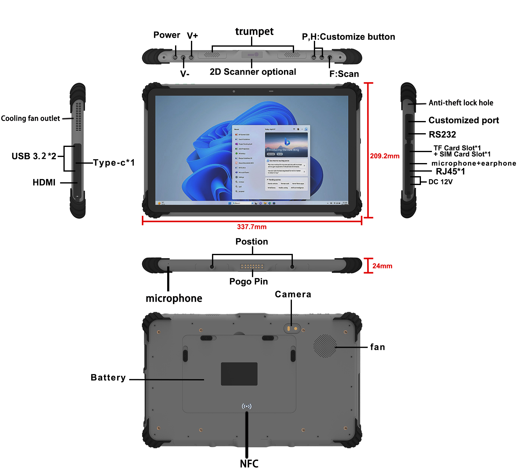 Прочный планшет с системой Windows 11 Pro: оснащен мощным дека-ядерным процессором Intel i5, 13,3-дюймовым HD-экраном с длительным временем автономной работы и эффективным подключением 4G / 5G / WiFi 6; защита IP65 и защита от падения адаптируются к сложным сценариям, встроенный вентилятор охлаждения и большая память, а также поддерживает настройку, что делает его надежным инструментом для профессиональных операций в логистике, промышленности и других областях.