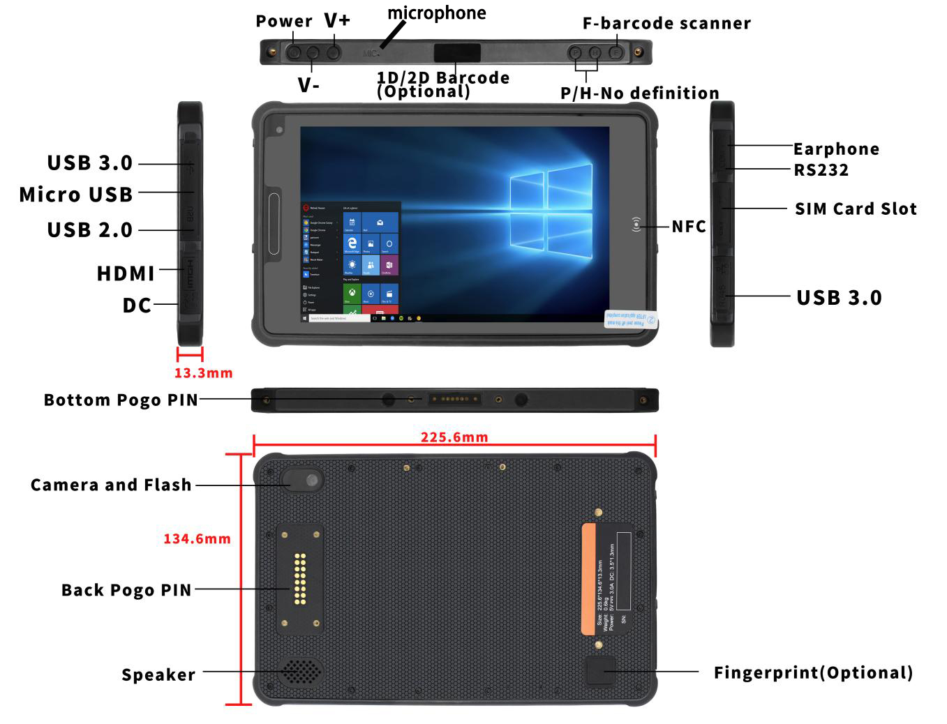 HDMI×1, слот для SIM-карты×1, RS232×1 (мини-USB), разъем для наушников×1, разъем для питания×1 (3,5×12 мм), USB-A: USB 3.0×2 + USB 2.0×1 Нижние разъемы pogopin: USB 2.0; Зарядка; RS232 Задние разъемы pogopin: USB 2.0; RS232 |